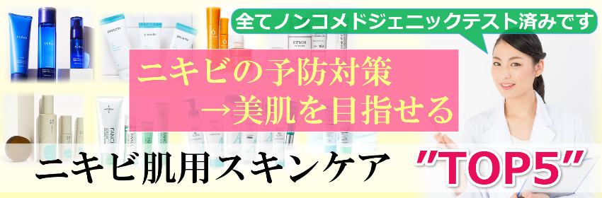 当サイトにてニキビに悩んだ経験のある女性約500名を対象に調査。以下掲載の製品は全てノンコメドジェニックテスト済みです。